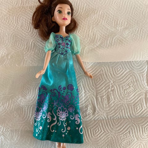 Disney dukke med rosa joggedress. Dukken har langt brunt hår og er kledd i rosa hettegenser og bukse med motiv av en Disney-figur på genseren. Joggedressen har glidelås foran og dekor langs buksebenene. Dukken har myk kropp og faste armer, ben og hode. Egnet som lekedukke for barn eller til rollelek og dukkestell.