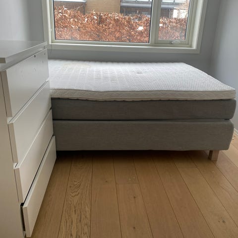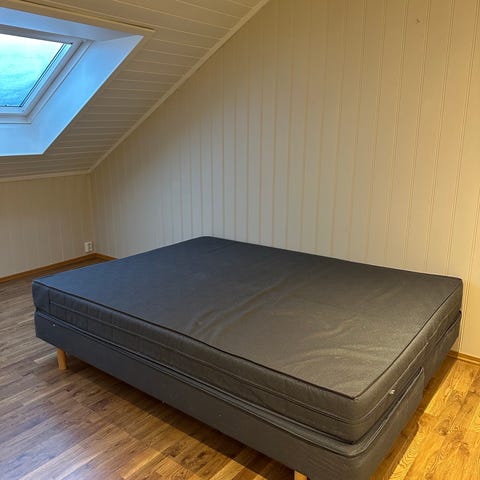 Sengen er fra Amøbler og er medium/fast. Hel sokkel så man slipper å tenke på støv under sengen.