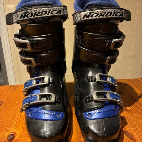 Nordica alpinstøvler i svart med røde og grå spenner. Størrelse 23,5.