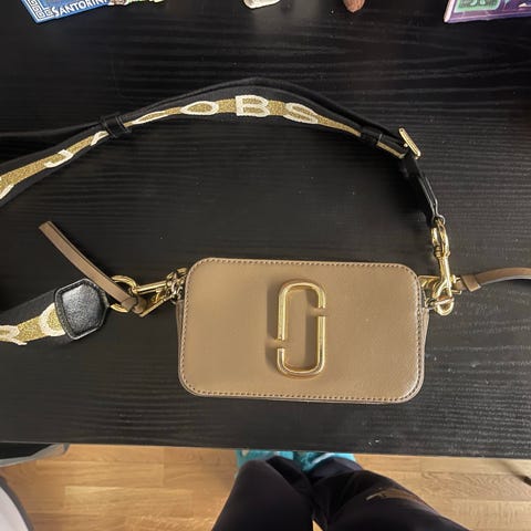 Marc Jacobs Snapshot skulderveske i skinn for dame. Vesken er i grønt skinn med struktur og har gullfargede metalldetaljer og logo på fronten. Den leveres med justerbar og avtakbar skulderrem i tekstil med Marc Jacobs-logo. På baksiden er det en utvendig lomme, og hovedrommet lukkes med glidelås. Innvendig har vesken et delt hovedrom med fôr. Egnet til hverdagsbruk og til å oppbevare mindre nødvendigheter som mobil, nøkler og lommebok.