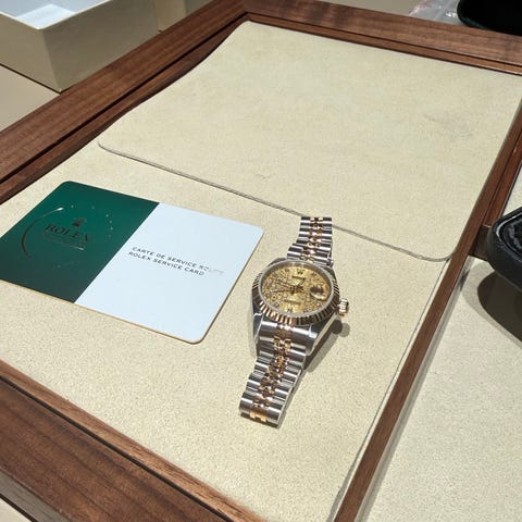 Rolex dameklokke i rustfritt stål med lenke i metall og blå urskive. Klokken har analog visning med time-, minutt- og sekundviser. Urkassen er rund med skrukrone på høyre side. Låsen er foldelås med sikkerhetsmekanisme. På bildene følger det med Rolex-etuier, dokumentmappe og servicekort som viser serienummer og modellreferanse. Egnet som hverdagsklokke eller til mer formelle anledninger for dame.