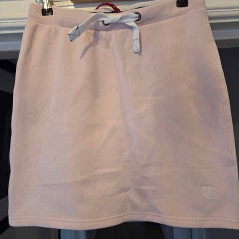 Gant skjørt i bomull for dame i størrelse S. Skjørtet er blått med elastisk linning og snøring i livet. Det har sidelommer og brodert Gant-logo foran. Lengden er kort til knelang, avhengig av høyde. Materialet er mykt og lett, egnet til hverdagsbruk. Det kan være noe slitasje eller flekker, se bilder for detaljert tilstand.