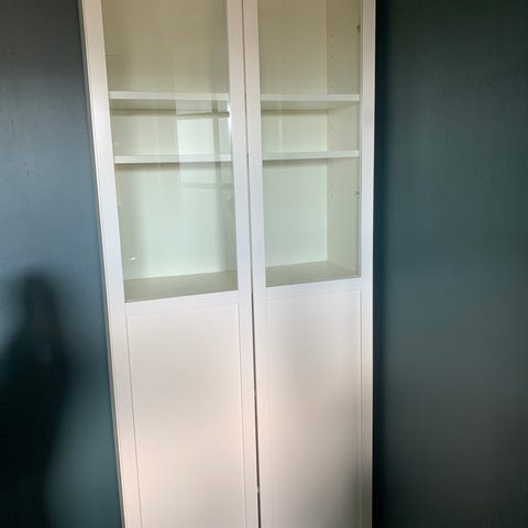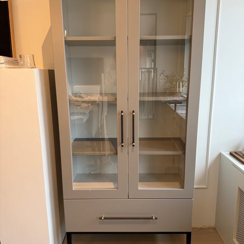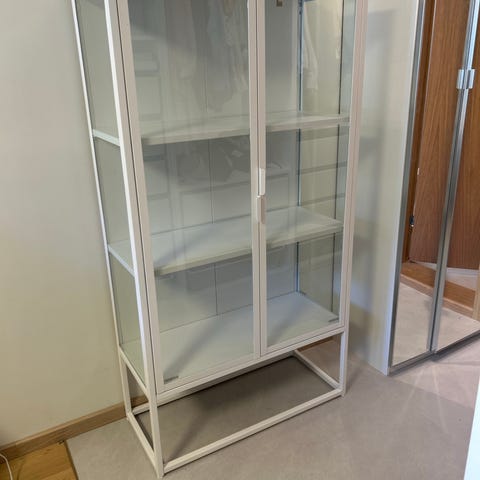 Vitrineskap i hvit høyglans. Kjøpt på Skeidar i sin tid. Dette er et solid og massivt skap som veier mye! Kom ferdig montert fra produsent og har aldri vært demontert.