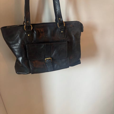 Veske satt sammen av flere semskede skinnfeller i ulike nyanser. En mindre skade på baksiden, men den vises ikke ved bruk - se bilde.