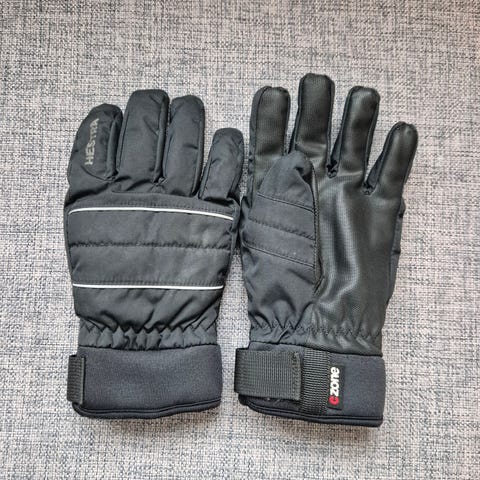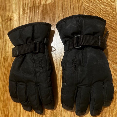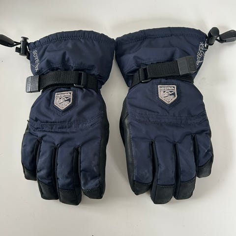 Pent brukte hansker fra Hestra i str 4, som tilsvarer 4-5 år i følge størrelsestabell (se siste bilde). Ingen hull eller skader, noe misfarging ved tomlene.