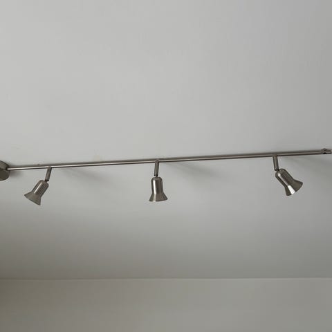Stilren, litt fancy og pen taklys (ca. 111 cm langt) med spotter i metall. Lampen har 4 justerbare spotthoder montert på en lang skinne som festes i taket. Utførelse i metall. Egnet som allmenn- eller punktbelysning i for eksempel stue, kjøkken eller gang. Bruker utskiftbare lyspærer i hver spot (lampen selges uten lyspærer).