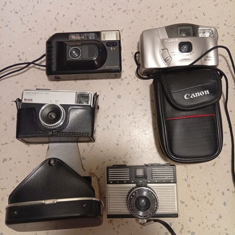 Kan sende, men bruker ikke FiksFerdig. Diverse vintage kameraer - gi bud pr. kamera eller samlet. Har ikke noe kjennskap om tilstand.