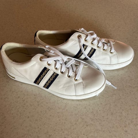 Geox sneakers joggesko i størrelse 39. Modellen er i lyse beige- og gråtoner med snøring foran. Overdelen er i kombinert materiale med tekstilfôr. Yttersålen har karakteristiske runde felter med ventilasjonshull. Passer som hverdagssko og til lett fritidsbruk.