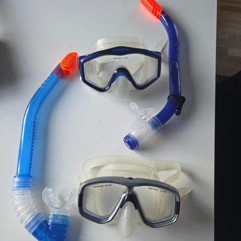 Brillene er brukt noen ganger, snorkel er ubrukt