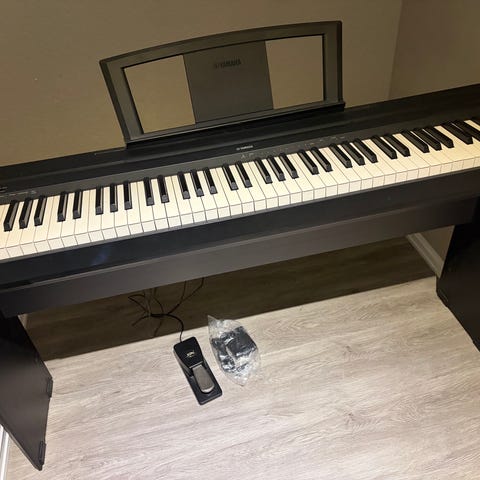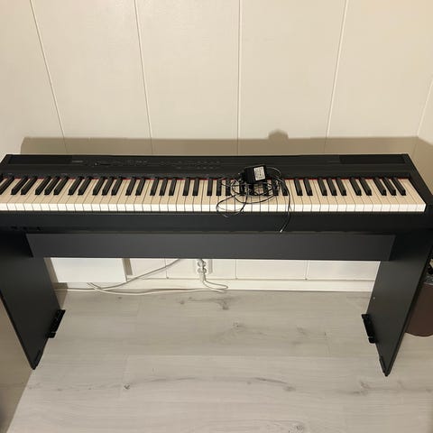 Yamaha digitalpiano med 88 tangenter i svart utførelse. Instrumentet har innebygd stativ og enkel kontrollseksjon med hovedvolum, knapp for grand piano-lyd og funksjonsknapp. Det følger med sustainpedal som kobles til via kabel. Egnet til øving hjemme, undervisning eller generell bruk der det er behov for et kompakt digitalpiano med fullt klaviatur.