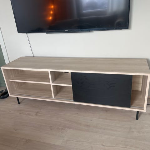 Pent brukt Bestå tv-benk fra Ikea med svarte fronter og hylle med ben.