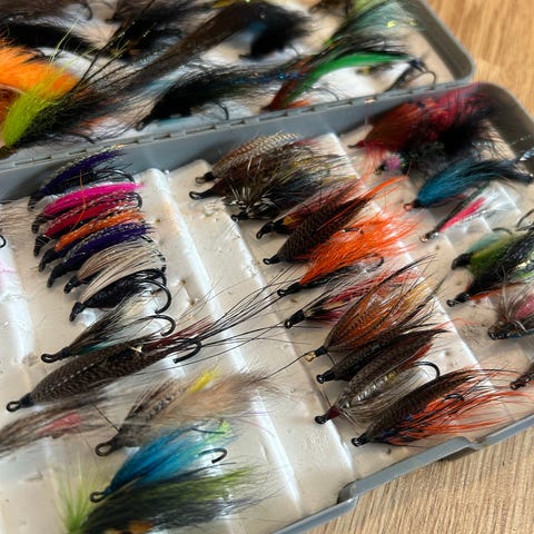 Selges her et flott flueskrin med laksefluer.