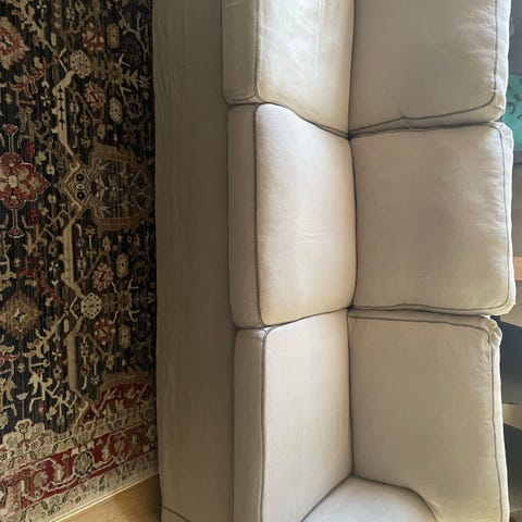 &Tradition sofa i lyst skinn. Sofaen har polstret sete og rygg med inndelte sittefelt. Egnet som sittemøbel i stue eller oppholdsrom. Designet av Ingo Maurer er oppgitt i annonsens attributter.