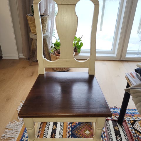 8 stykk spisestoler/stoler, bonderød i farge. Slitesterkt trekk på setet, grå i farge. Oppgitt pris per stykk; kr 150,-. Den ene stolen har bitemerker på deler av stolbenet, så samlet kjøp av alle stolene; kr 1000,-. Stolene står på hytte på Budor, Nordlyset.