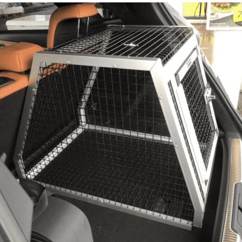 4pets Milan M hundebur i aluminium i grå farge. Bur for bruk i bil, med solid ramme og gitterløsning i metall. Størrelse M med utvendige mål ca. H 68,6 x B 54,5 x D 83,5 cm. Vekt på bur ca. 15 kg og nominell lastekapasitet 36 kg. Egnet for transport av hund i bagasjerom, med utforming tilpasset plassering mot baksete og bakluke. Burdøren åpnes foran og låses med dreiehåndtak. Laget for sikker og stabil montering i bilens bagasjerom.