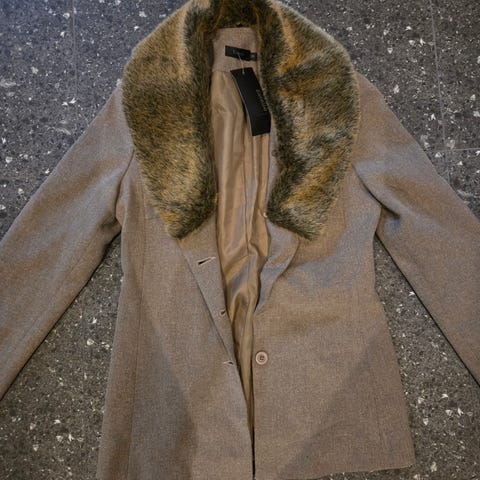 Bazer/jakke i merket Share for dame i størrelse 36. Jakken er flerfarget med rutemønster og har krage med avtakbar fuskepels. Materialet i ytterstoffet er 85 % polyamid og 15 % ull. Jakken har knappelukking foran, lange ermer og innsvinget fasong. Fôret er i polyester for økt komfort. Passer til bruk over bluser, gensere eller kjoler i hverdagen eller til mer formelle anledninger.