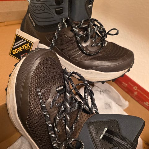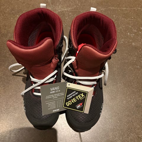 Rossignol Viper trekkingstøvler i størrelse 39. Halvhøye tursko med snøring, overdel i syntetisk materiale og gummisåle med grovt mønster for godt grep på underlaget. Fargekombinasjon beige, grå og oransje. Egnet til fotturer og annen bruk der det er behov for stabile og robuste sko.