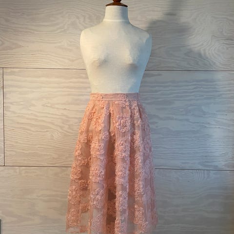 Ubrukt. Rosa, lilla og sort strikk i livet. Lite underskjørt sydd fast. Kostyme eller fest.