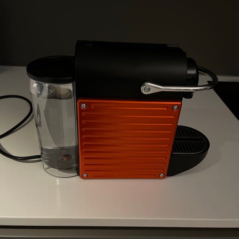 Maskinen bruker Nespresso-kapsler og har avtagbar vanntank bak.