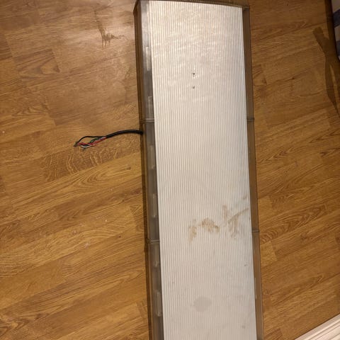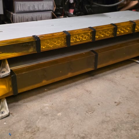 Varsellys lysskinne for montering på kjøretøy. Enheten har oransje lyskupler i plast på sidene og lysfelt i midtseksjonen. Egnet som roterende eller blinkende varsellys på tak av kjøretøy som traktor, lastebil eller anleggsmaskin, avhengig av type lysinnsats og elektrisk opplegg. Monteres på tak eller stativ med festeanordningene som er integrert i lysskinnen. Mål og elektriske spesifikasjoner bør kontrolleres før montering for å sikre kompatibilitet med aktuelt kjøretøy og strømforsyning.