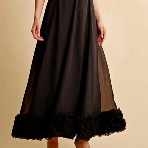 Skjørtet har en maxi lengde og mye volum. Kanten på skjørtet har pene volangdetaljer. Skjørtet har beltebøyler og kommer med et løst, matchende belte. Bør strykes.