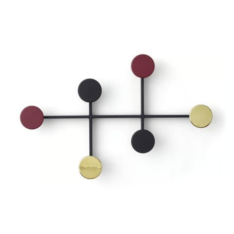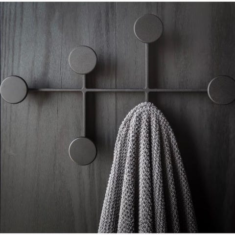 Audo Copenhagen knaggrekke i svart metall. Vegghengt modell med seks runde knagger plassert på et kryssformet stativ. Egnet for oppheng av klær, håndklær eller tilbehør i gang, soverom, bad eller andre rom. Nøytral, mørk farge som passer inn i ulike interiørstiler.