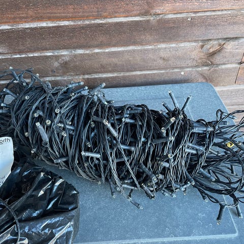 Lyslenke fra Clas Olsson. Brukt rundt stor veranda på ca 30 kvm. Husker ikke hvor lang den er, men den er lang. Den er fint surret opp på en kleshenger, klar for å henges lett opp igjen.