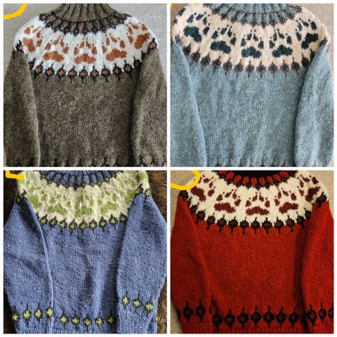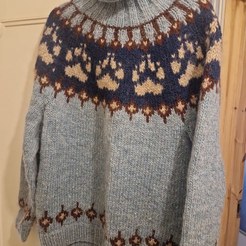 Strikket i alafosslopi. Det garnet inneholder både dekkhår og underull, og er derfor vannavstøtende og utrolig varmt.