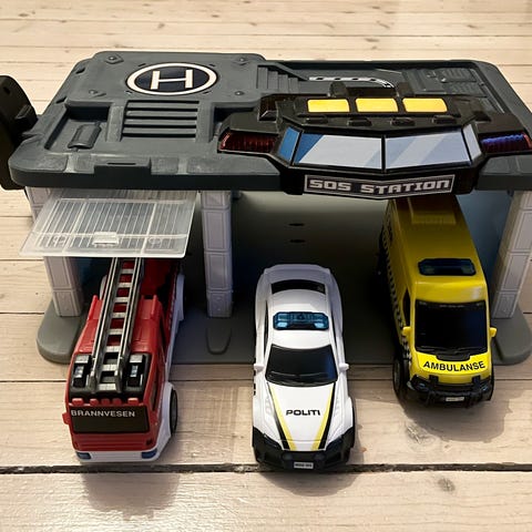 SOS Station, lekebil set og helicopter med lyder oh lys. Den har blitt brukt ganske mye og bilene og helikopteret er ikke fra den originale leke set
