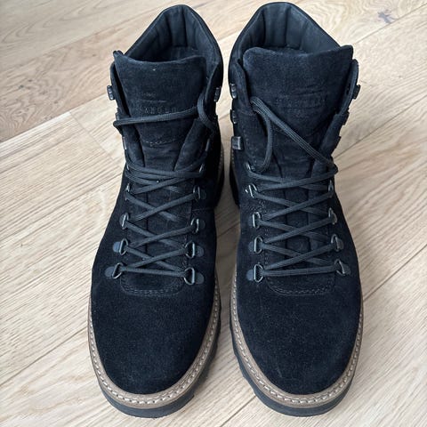 Stockholm Design Group vinterstøvler i størrelse 43. Støvlene har brun overdel med snøring og krokfester, samt kraftig, lys såle med grovt mønster som gir godt grep. Modellen er ankelhøy og egnet for bruk i kaldere vær og på variert underlag. Passer som hverdags- og fritidsfottøy i vintersesongen.