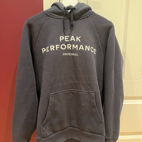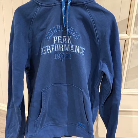 Peak Performance hettegenser for herre i størrelse M. Genseren er blå og laget i bomull. Klassisk modell med hette, justerbare snorer og stor kengurulomme foran. Ribbestrikkede mansjetter og linning. Logotrykk med Peak Performance på brystet.