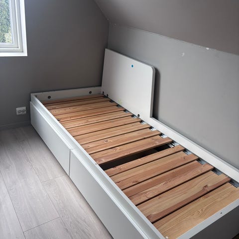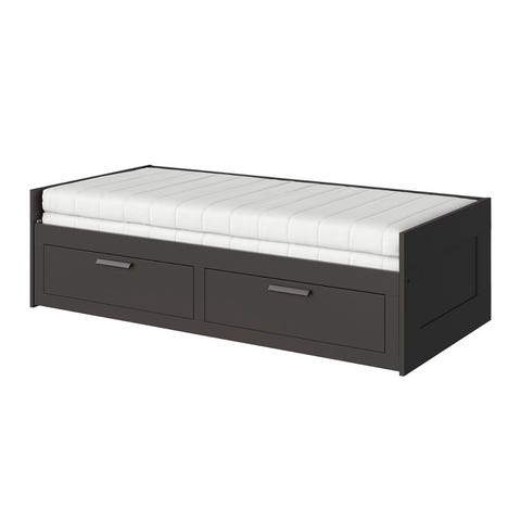 IKEA Brimnes dagseng med skuffer i svart utførelse. Sengen har rygg- og sidepanel og fungerer som enkeltseng til daglig bruk. Under sengen er det to romslige uttrekksskuffer som kan brukes til oppbevaring av sengetøy, puter eller annet utstyr. Liggeflaten består av ribbebunn. Passer i soverom, gjesterom eller under skråtak der det er behov for både seng og oppbevaringsplass. Madrass følger eventuelt med etter egen avtale mellom kjøper og selger.