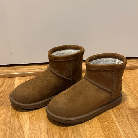 Fake uggs i størrelse 37, liten. Varme, høy såle, brukt, men mye bruk igjen. Syntetisk skinn og for. Den høye sålen er praktisk for å ikke bli våt og få flekker.