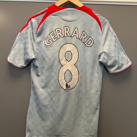 Adidas Liverpool fotballdrakt i grå farge med røde detaljer. Drakten har klassisk Adidas-logo på brystet, Liverpool FC-klubbmerke og «Candy»-sponsortrykk foran. Størrelse er oppgitt til 38–40" på lappen i nakken. Kortermet modell med rund hals og karakteristisk geometrisk mønster i stoffet. Passer til bruk som supportereffekter eller til fritidsbruk.