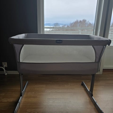 Chicco bedside crib i grå farge. Sengen har nettingpaneler på sidene som gir lufting og innsyn til barnet. Høyden kan justeres for tilpasning til voksenseng, og understellet har stabile ben. Leveres med transportbag som gjør den enkel å ta med på reise eller oppbevare når den ikke er i bruk.