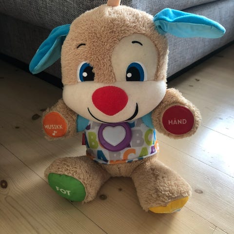 Fisher-Price interaktiv kosehund. Myk bamseformet hund med lysende hjerte på magen og flere trykkepunkter som er merket med tekst, som hånd, fot, øre og musikk. Når barnet trykker på de ulike feltene, aktiveres lyd og musikk. Egnet som aktivitetsleke for små barn for å øve på begreper og kroppsdelnavn gjennom lek.