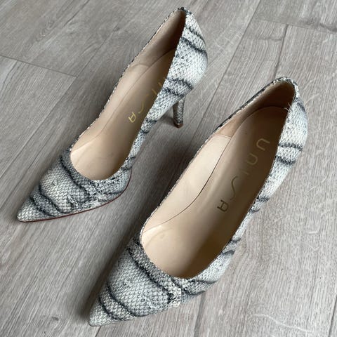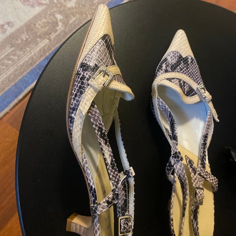 Elegant og unik sko i skinn - over, under og inn i. Ingen bruksmerker. Er str 37,5, men passer like godt str 38. Brunbeige farger med remmer i sort.