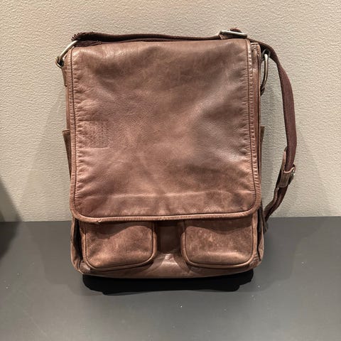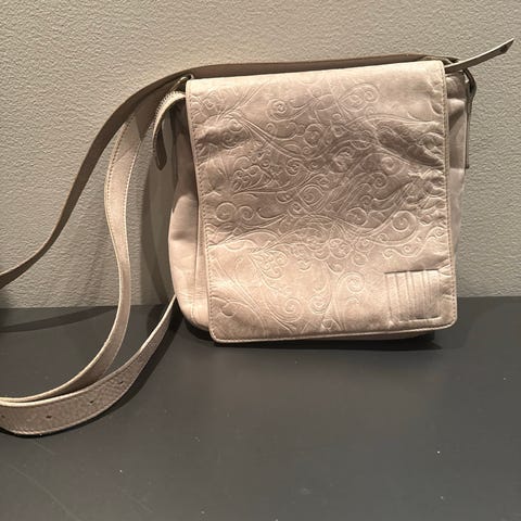 Moo skulderveske i lær for dame. Vesken er laget i brunt skinn med klaff foran og justerbar skulderrem. Den har flere rom med glidelås, både under klaffen og i hovedrommet, samt lyst innvendig fôr. Passer til daglig bruk med plass til nødvendigheter som lommebok, mobil og småting.