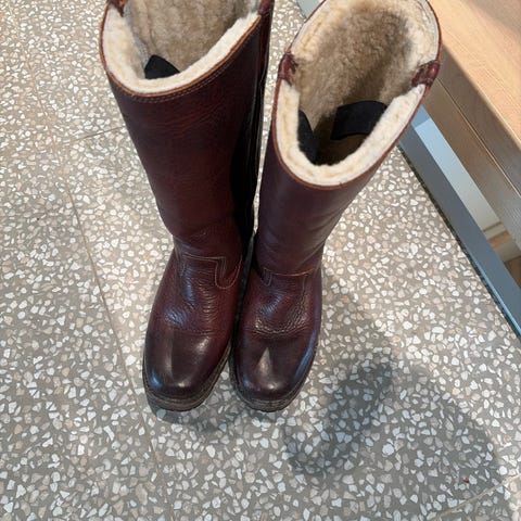 Biekso størrelse 41 selges. Fra 1980 tallet. De er velbrukte. Skinnet og sømmene ser hele ut. Sålene er slitte og glatte. Har velbrukt ullfór. Dette er nostalgi. Overlevering/ forsendelse avtales direkte. Pris kr 200