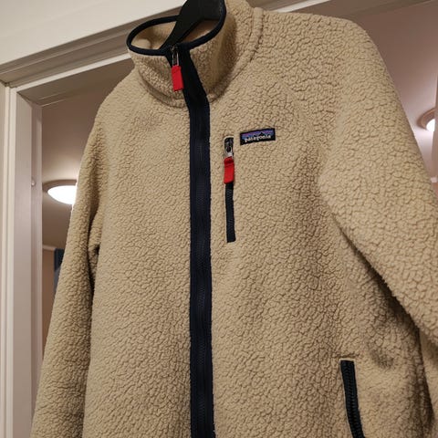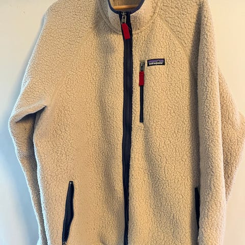 Patagonia fleecejakke for herre i størrelse XL. Jakken er hvit med kontrastdetaljer og hel glidelås i front. Den har brystlomme med glidelås og to sidelommer med glidelås. Materialet er fleece som gir god isolasjon og komfort. Passer til hverdagsbruk og som mellomlag på tur og andre utendørsaktiviteter.