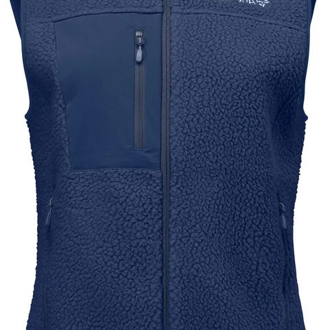 Norrøna fleecevest for dame i størrelse XL. Vesten er i mørk blå farge og laget i mykt, strukturert fleecemateriale med forsterkede paneler på skuldre og brystlomme. Den har høy krage, hel glidelås i front og en brystlomme med glidelås.