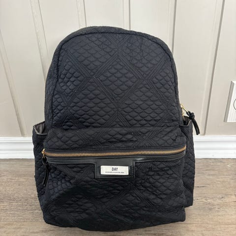 DAY ET ryggsekk i svart stoff. Sekken har et hovedrom med glidelås og en frontlomme med glidelås. Justerbare skulderstropper og bærehank øverst.