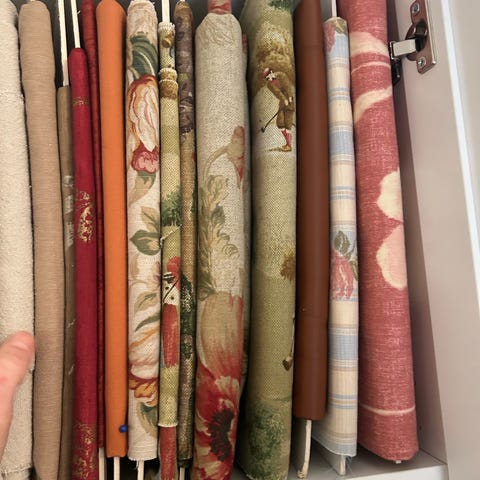 Stoffpakke med ulike stoffer, ensfarget og noen mønsteret.