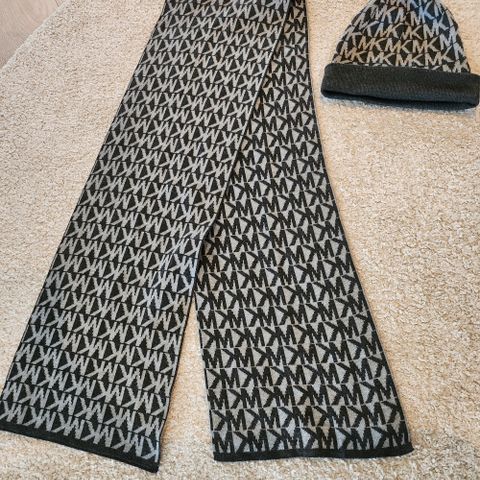 Michael Kors-sett med lue, skjerf og hansker for dame i brun farge. Settet er i one size og er laget hovedsakelig av akryl. Luen og hanskene har ribbestrikkede kanter, og hele settet har mønster med Michael Kors-logo.