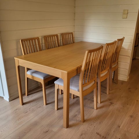 Bord og stoler har naturligvis bruksmerker. Noen små sprekker i laminat på bordplaten.