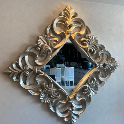 Speil med dekorativ, gullfarget ramme, antikk-inspirert. Rektangulær form med bred, profilert ramme og utskårne ornamenter i hjørnene og langs kantene. Speilet kan plasseres stående på en kommode eller henges på vegg, avhengig av opphengsløsning. Passer i stue, gang, soverom eller andre rom der man ønsker et speil med klassisk uttrykk. Kan henges både horisontalt og vertikalt. 63x73,5 cm. Kan møtes i Asker Sentrum (så sant tidspunktet passer for meg).