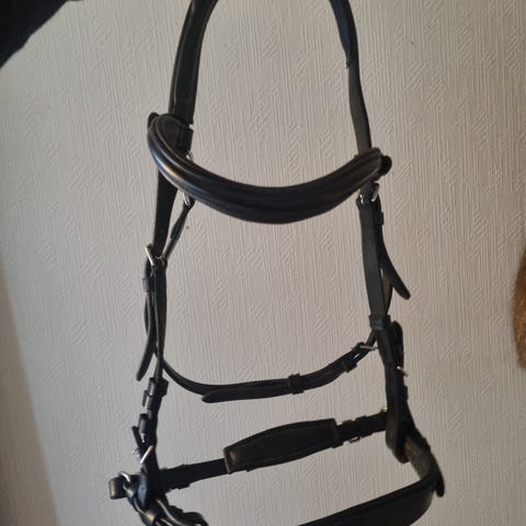Meget pent brukt svart hodelag i størrelse cob selges da jeg har for mange. Fremstår som veldig lite brukt, ikke brukt i mitt eie. Veldig god padding over nese, hake og nakken.