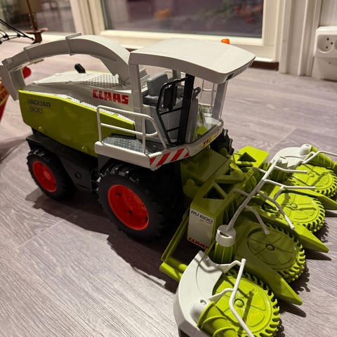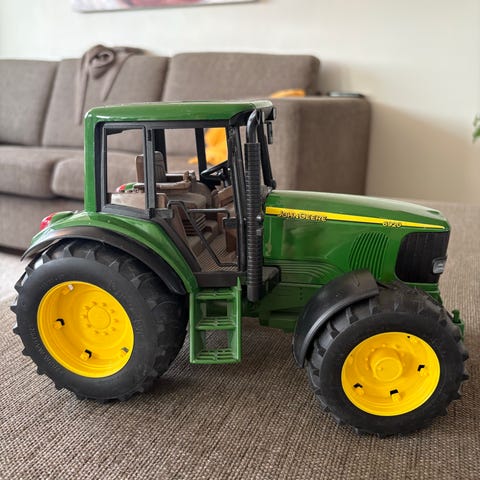 Bruder John Deere høyball presse i grønn plast. Modellen forestiller en landbrukspresse med detaljer som hjul med gule felger, trekkstang for tilkobling til traktor og bevegelige deler. Det følger med rundballer i plast som tilbehør. Egnet som landbruksleke for barn som liker traktorer og gårdsutstyr.