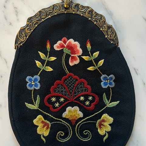 Vintage Rogaland Rogalandsbunad Frafjord Frafjordmønster bunadsveske veskelås nysølv broderi bunadstilbehør festdrakt tradisjon håndarbeid ullveske sølvplett retro norsk tradisjon bunad 17. mai konfirmasjon antikvitet bunadsutstyr tilbehør husflid håndlaget nasjonaldag festantrekk stavanger sandnes rogalandmønster tekstilhistorie lomme bunad festdrakt veske 60 GR H frafjordsbunad frafjordbunad