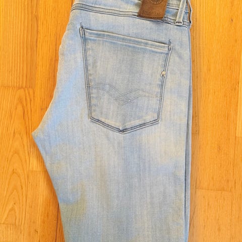 Replay Anbass Hyperflex jeans i blå denim, str. W30/L32. Klassisk 5-lommers modell med glidelås. Pent brukt, uten feil. Lett bukse med god stretch. Kan sendes mot porto.